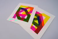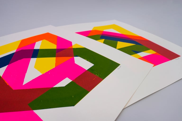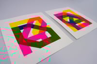 Series of 2 3-color screen prints (blue, yellow, neon pink) on 250g intense white Ursus paper.